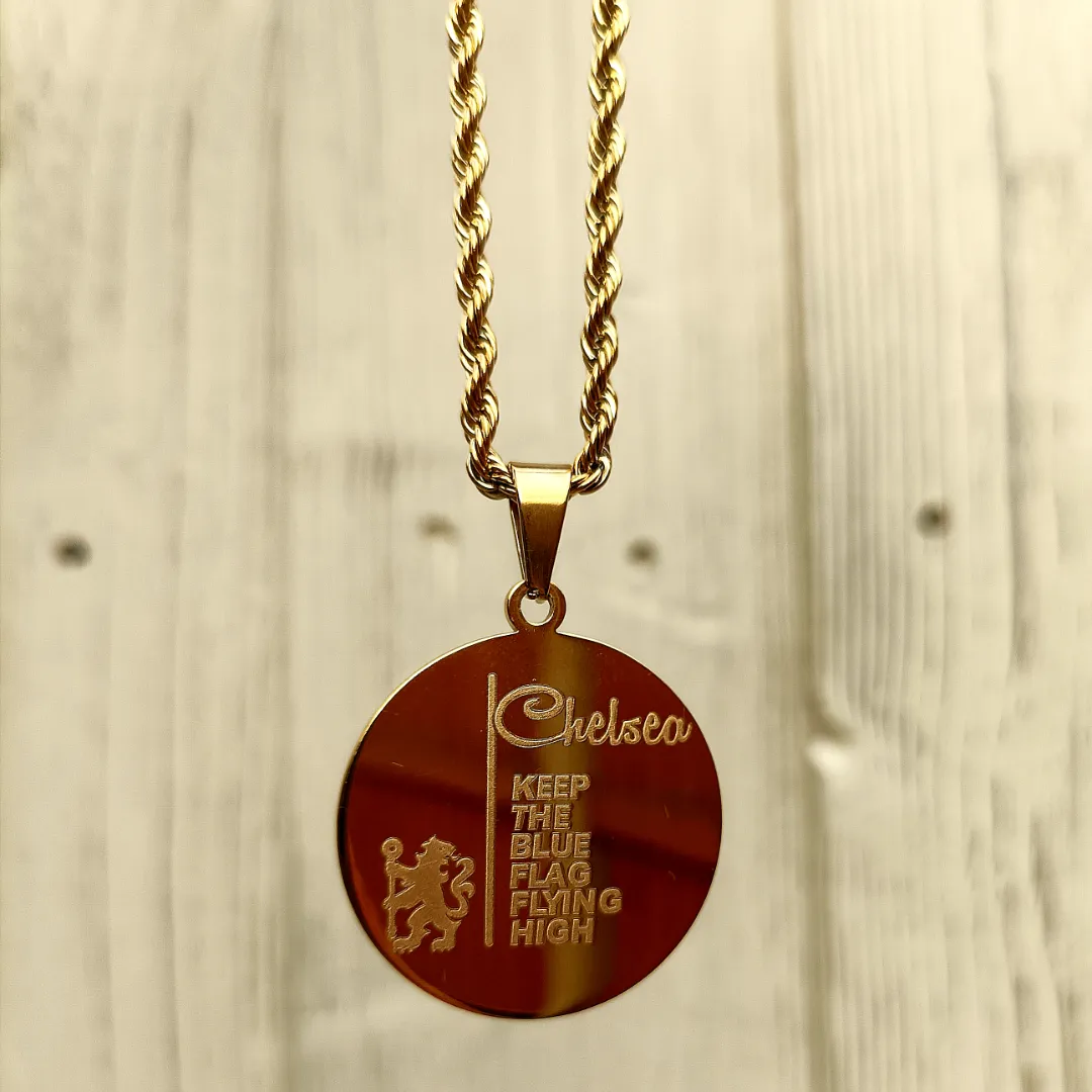 The Chelsea Pendant is a stunning tribute to Chelsea Football Club and its loyal fanbase. It features the iconic Chelsea FC crest on the front and the motto “Keep The Blue Flag Flying High” engraved on the back. This pendant lets you wear your team pride daily, whether you’re cheering from Stamford Bridge or supporting from afar. It is ideal for fans who want a bold and stylish way to display their dedication.