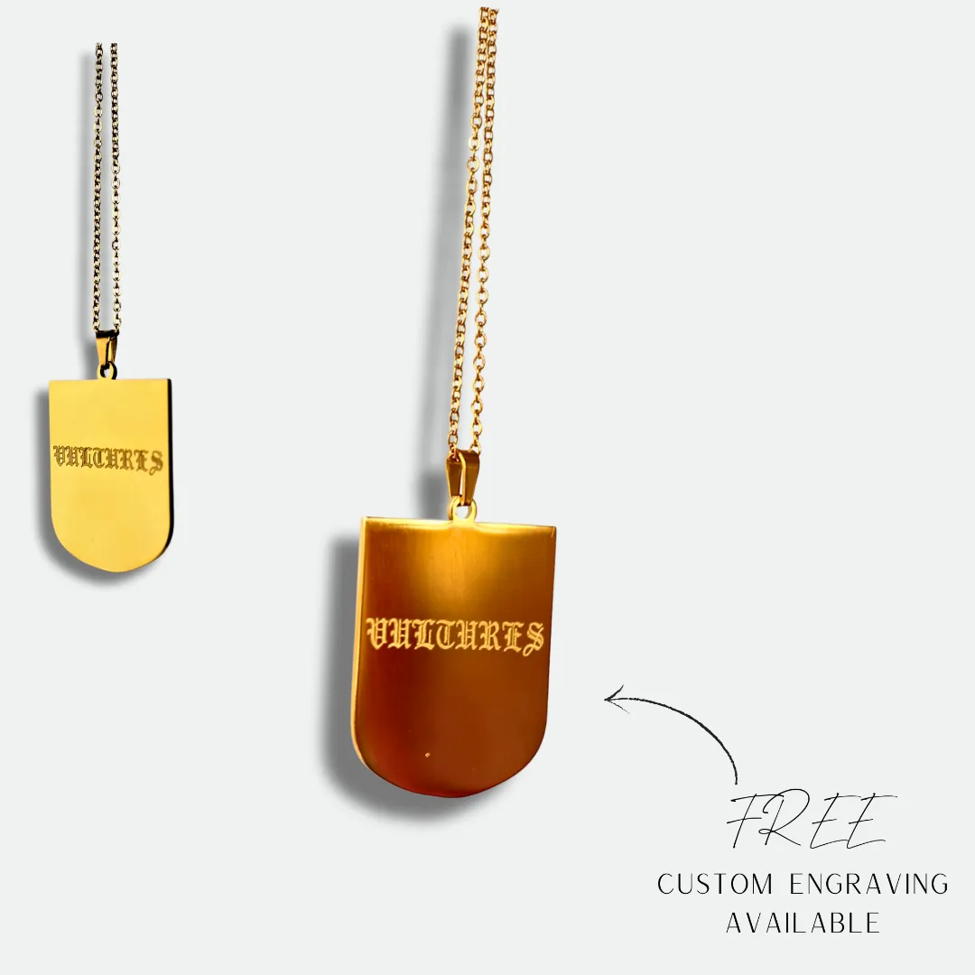 The Vultures Pendant draws inspiration from Kanye West and Ty Dolla Sign’s Vultures album artwork. Featuring the striking vulture symbol, this pendant is a perfect tribute to the album and its cultural significance. Whether you’re a fan of the music or appreciate the bold design, this pendant captures the essence of Kanye West and Ty Dolla Sign’s collaboration. You can personalize the back of the pendant with any engraving, such as lyrics or meaningful dates, to make it truly your own.