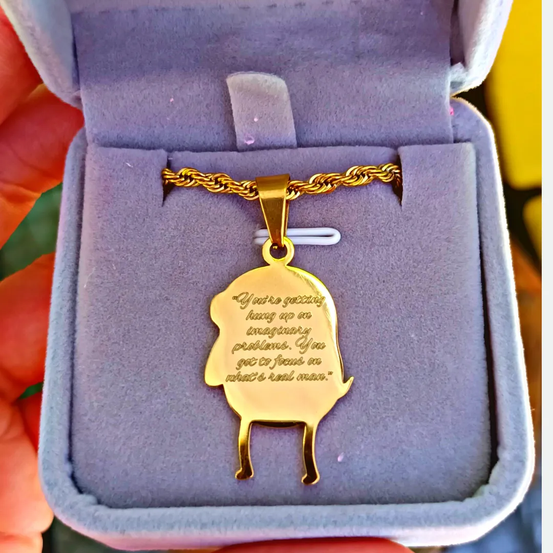 Celebrate your love for Adventure Time with this high-quality Jake the Dog pendant. Featuring the lovable character from the hit show, this gold-plated pendant captures the spirit of Jake’s carefree and wise personality. The back is engraved with one of Jake’s iconic quotes: “You’re getting hung up on imaginary problems. You got to focus on what’s real, man,” reminding you to keep your priorities straight, just like Jake!