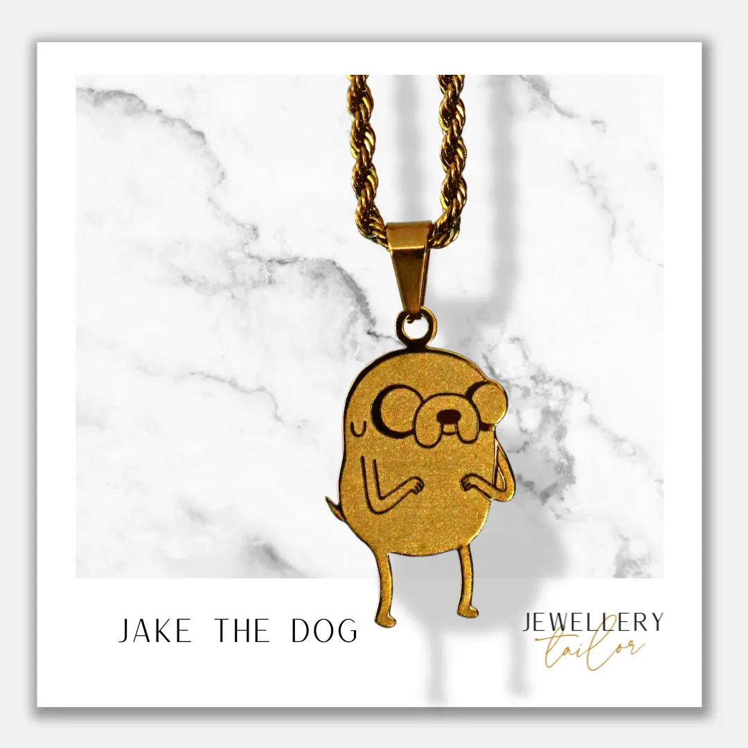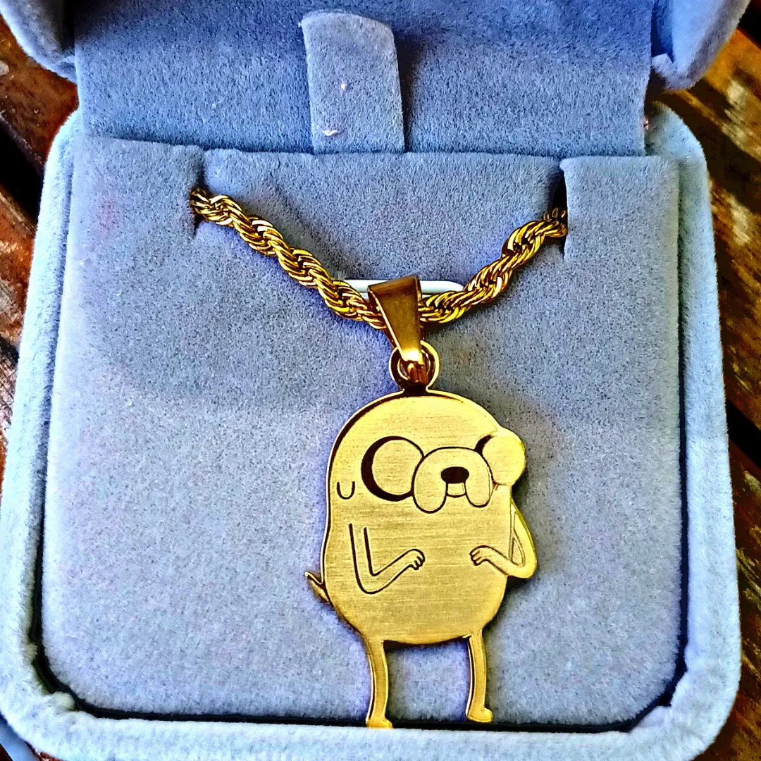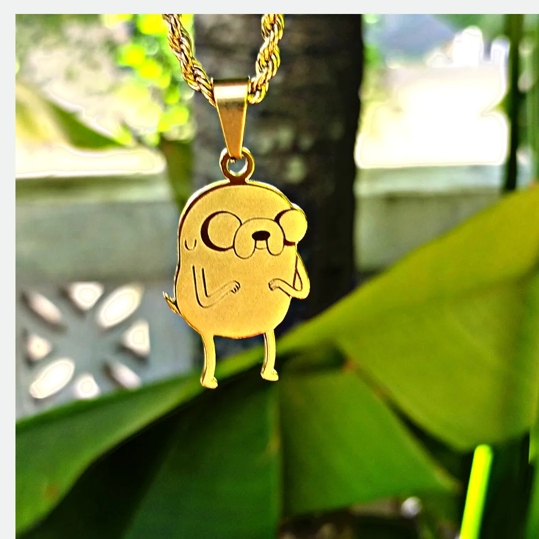 The Jake the Dog pendant is crafted from 18k gold-plated stainless steel, featuring custom engraving. Waterproof, sweatproof, and perfect for Adventure Time fans with free worldwide shipping.