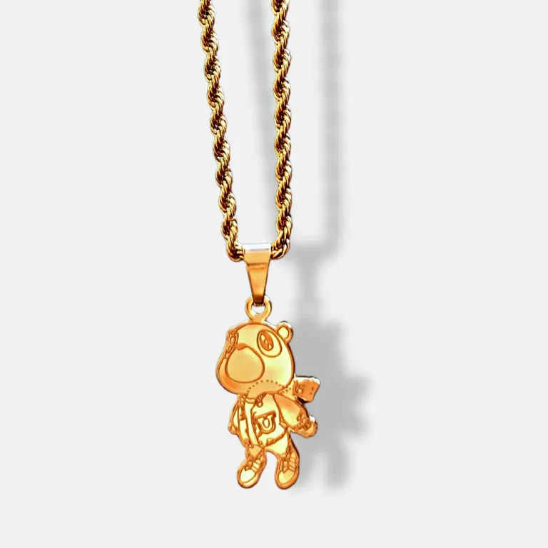 Crafted from 18k gold-plated material, this pendant is designed to be both stylish and durable. It is sweatproof and waterproof, ensuring long-lasting wear. The bear design is finely detailed, making this pendant a unique and standout accessory for any Kanye West fan.