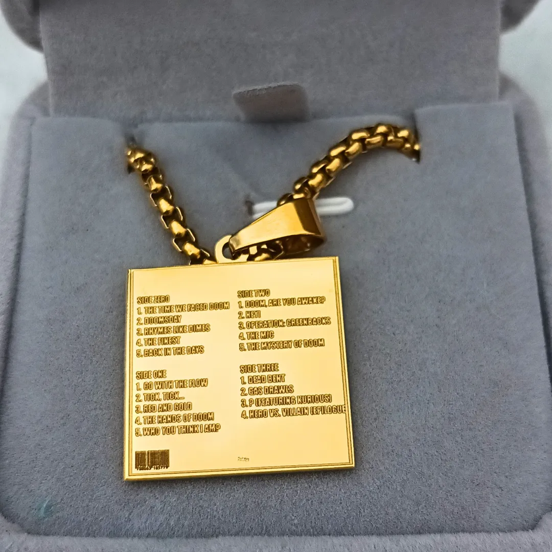 Crafted from 18k gold-plated or platinum-plated material, this pendant offers both style and strength. Designed to last, it is sweatproof and waterproof, making it perfect for daily wear or as a statement piece at concerts and events. The detailed design of the Doomsday album art on the front makes this pendant a standout accessory for fans of MF DOOM and classic hip hop.