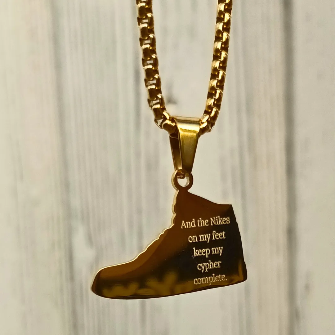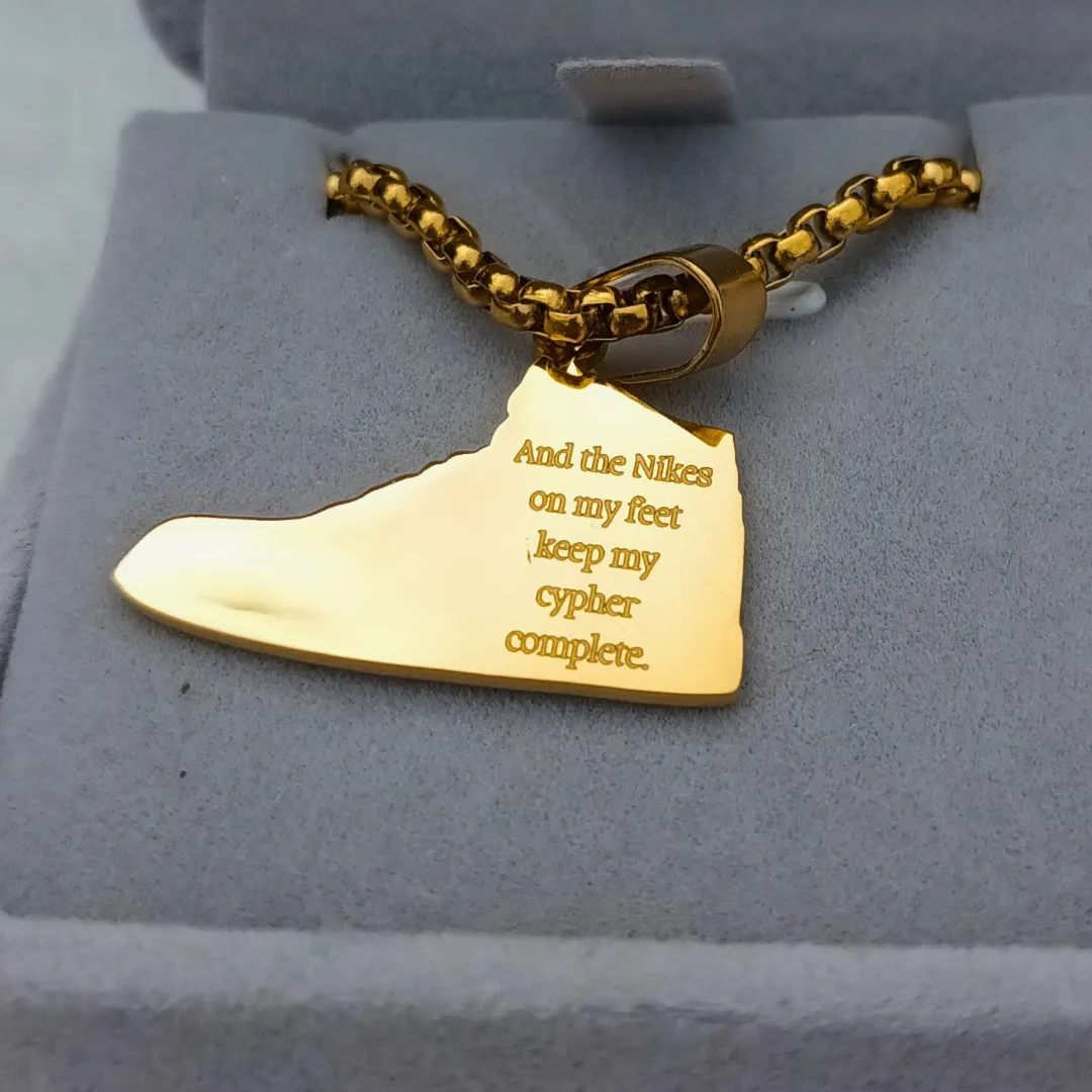 Celebrate your love for Mac Miller and sneakers with this Nike Shoe Pendant, inspired by the iconic lyric from the track โNikes on My Feetโ. Crafted with stunning attention to detail, this pendant replicates the classic sneaker design and features an option to engrave a memorable lyric on the back, such as “And the Nikes on my feet keep my cypher complete”. A true homage to both Macโs artistry and streetwear culture.