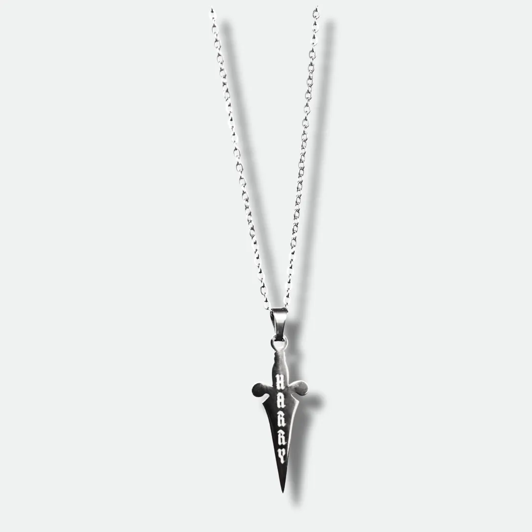 High-quality silver or 18k gold-plated dagger pendant with custom name engraving. Durable, sweat, and waterproof. Perfect for expressing strength and individuality.
