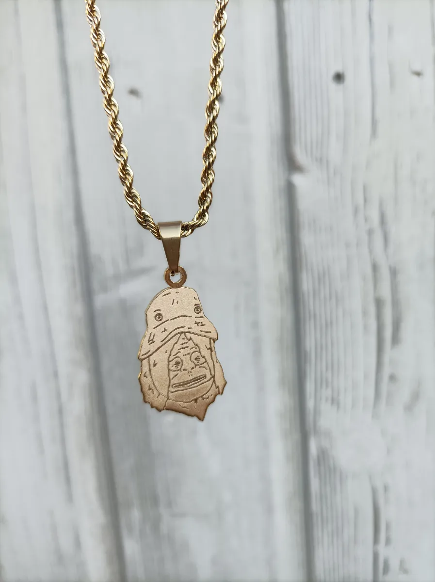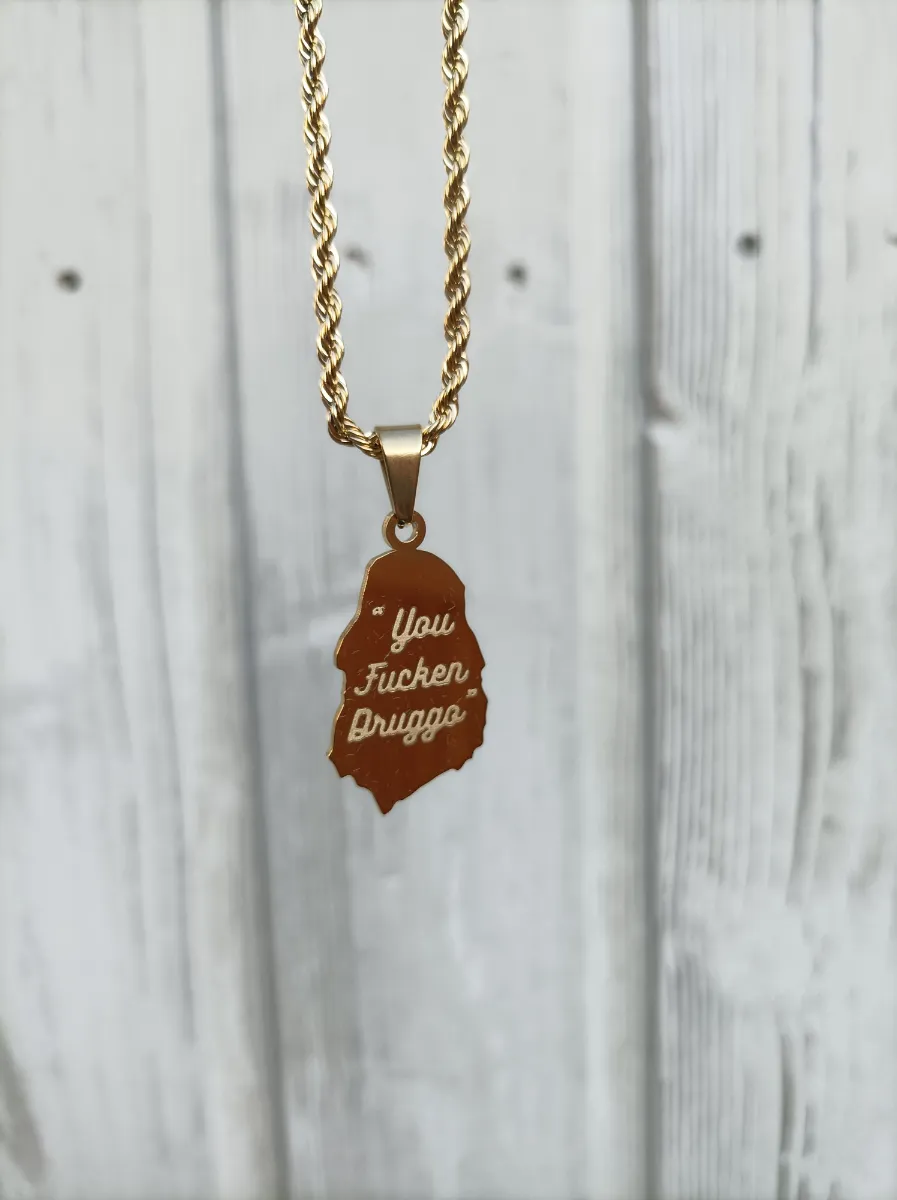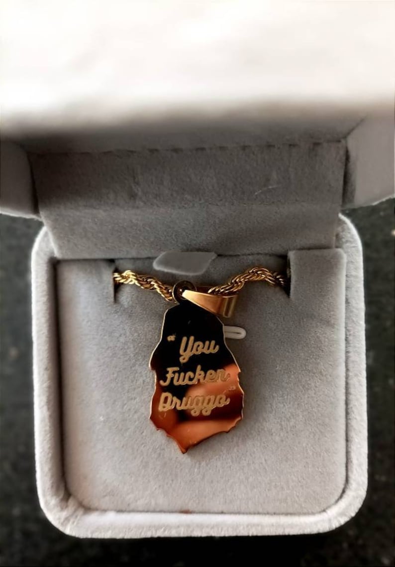 The Sassy Pendant from the Big Lez Show is waterproof and sweatproof, plated in 18k gold with the famous quote “You fucken druggo” engraved on the back.