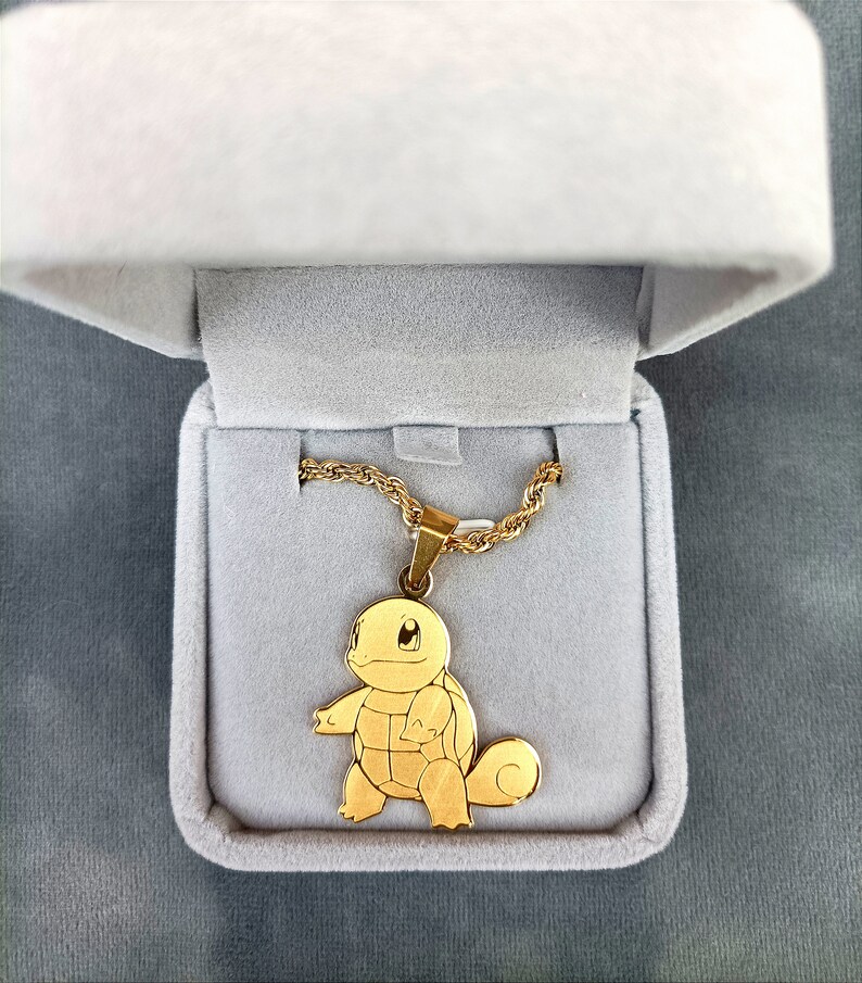 Show your love for the adorable and iconic Squirtle with this elegant gold-plated pendant. Known for its water-type abilities and mischievous grin, Squirtle has captured the hearts of Pokémon fans everywhere. This pendant features a detailed engraving of Squirtle on the front, with the name “Squirtle” engraved on the back. It’s the perfect way to express your Pokémon pride, whether as a daily accessory or a meaningful gift for a fellow fan.